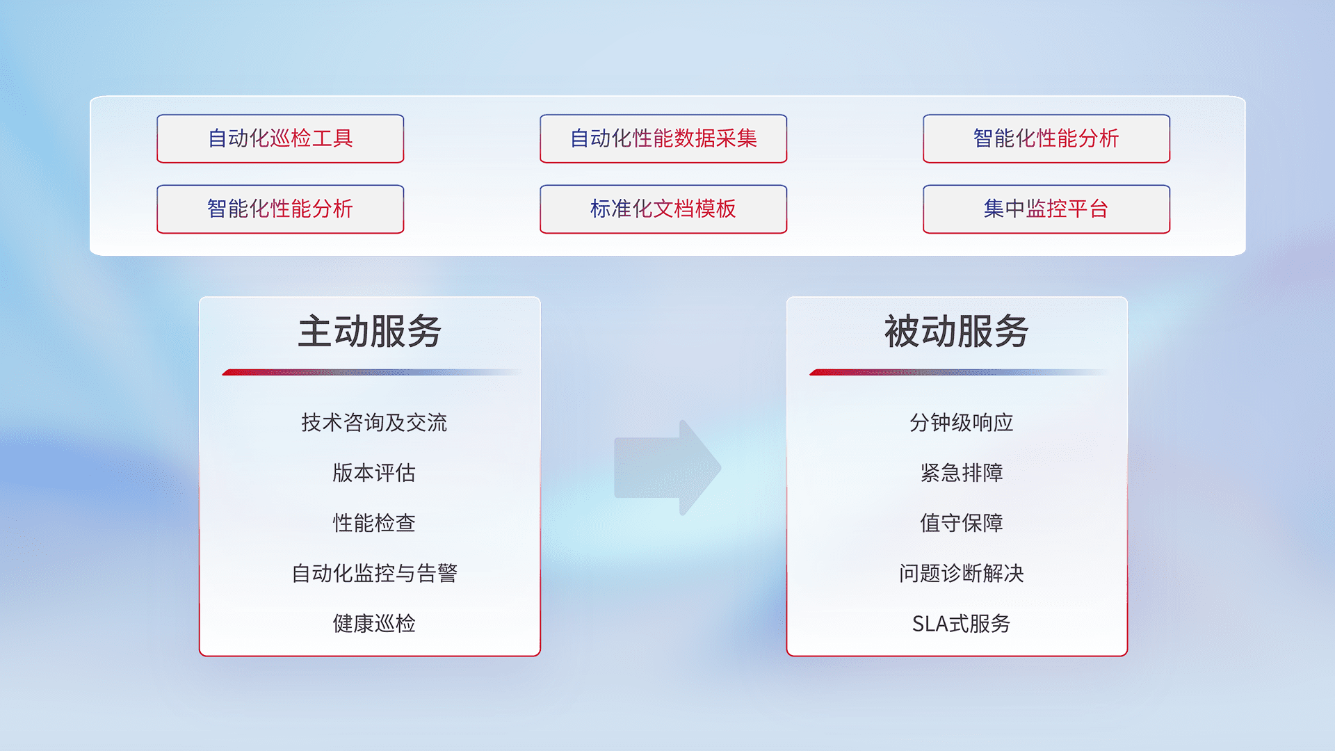 智能化工具和标准化文档,,,保障服务质量,,,提供主动服务(包含技术咨询、、版本评估、、、性能检查、、自动化监控与告警、、健康巡检)和被动服务包含(分钟级响应、、、、紧急排障、、、值守保障、、、问题诊断解决、、、、SLA服务)。。。